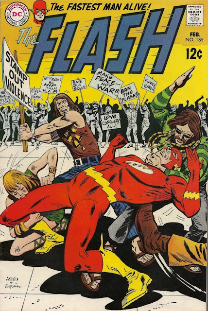 And this wolfish fellow does so by marshaling a few dozen young people-- only a few of whom look like hippies-- to sucker the Titanians with an overture of peace. Slightly in keeping with the cover, this is pure hypocrisy, covering an attempt at assassination, which the Flash handily prevents.